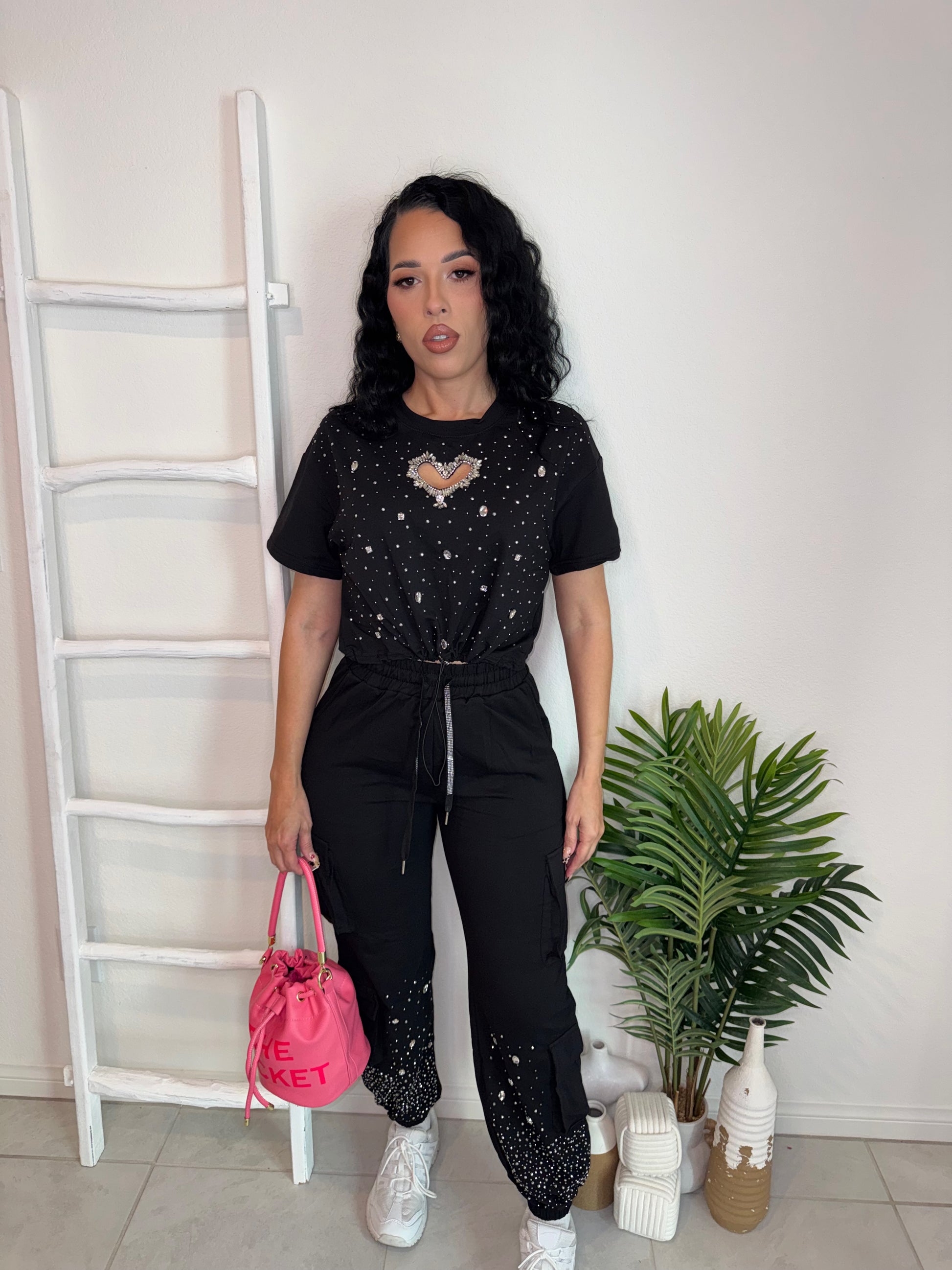 Set de dos piezas en color negro con delicados detalles brillantes y diseño de corazón al frente que aporta un toque femenino y sofisticado. Top de manga corta con ajuste cómodo y pantalón jogger de tiro alto con pretina elástica y acabado en pedrería en la parte inferior.