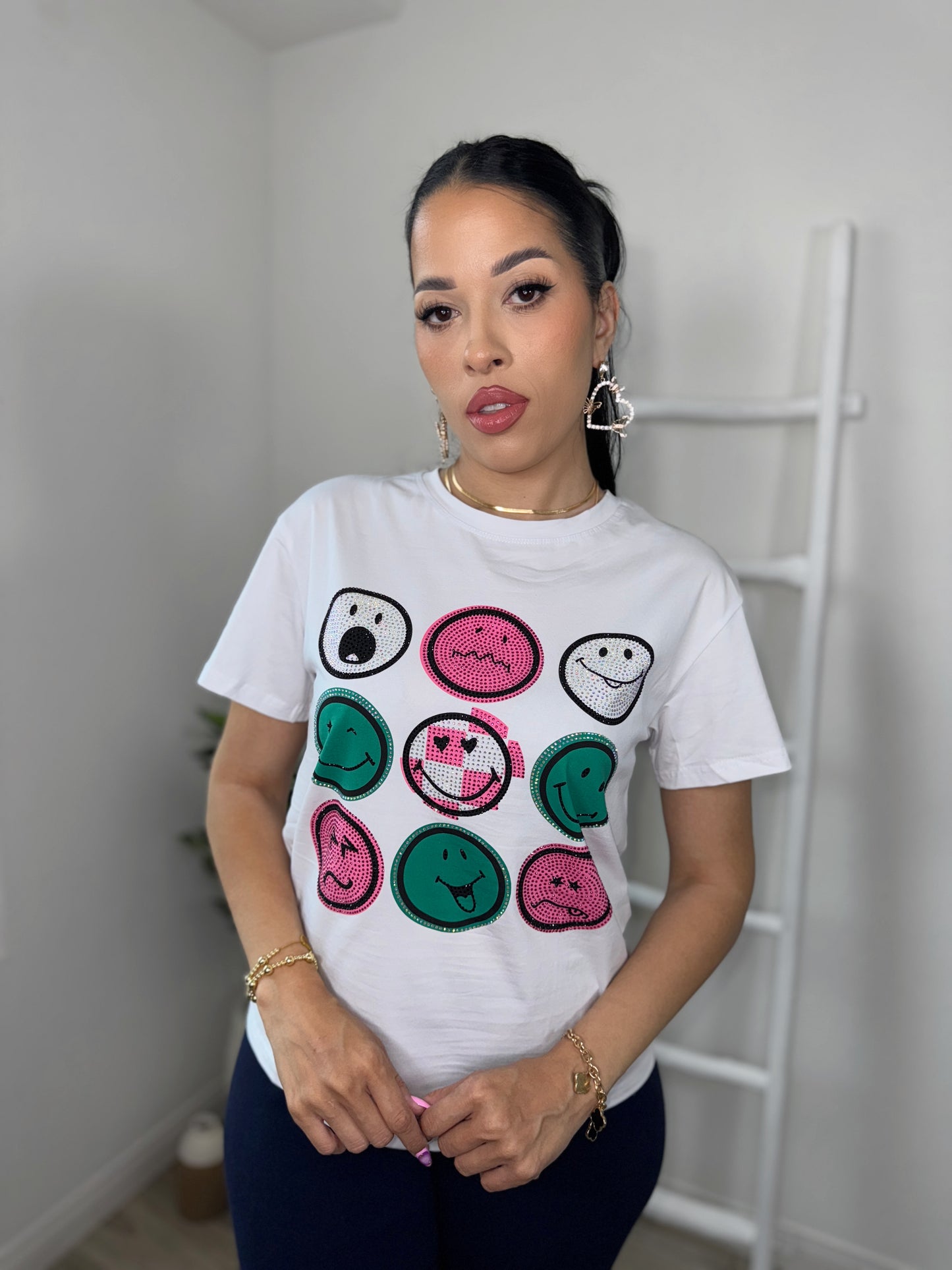 This playful graphic tee is all about attitude and style. Featuring bold emoji-inspired faces on crisp white cotton, it's the perfect casual piece to add personality to your look.