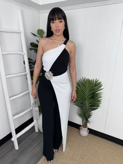 A show-stopper from the very first step. This asymmetric black and white jumpsuit with shimmering details is designed to command attention with elegance, confidence, and modern flair. Pair it with heels and a clutch for that unforgettable night out.