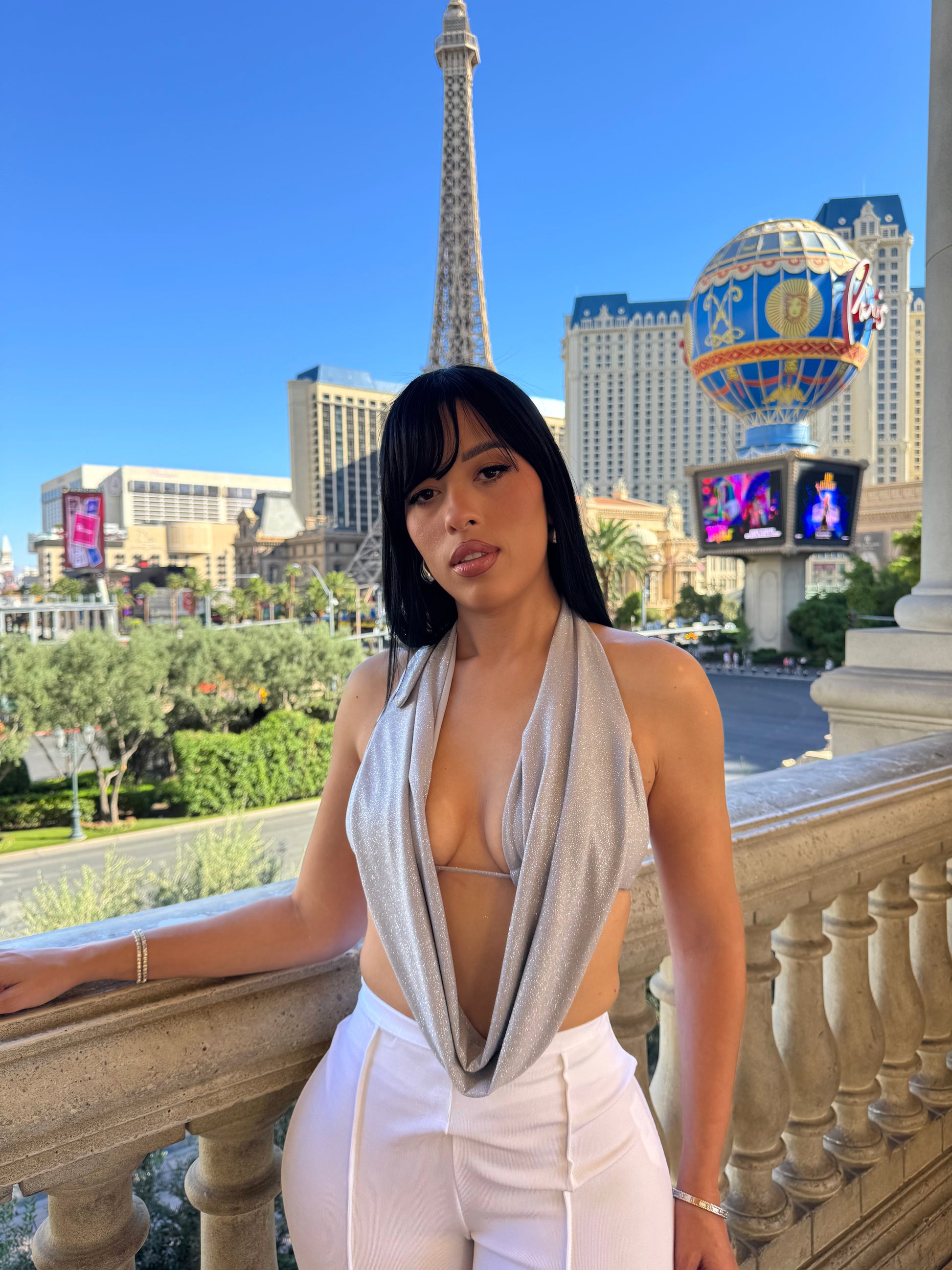 Turn heads with our Midnight Glow Silver Halter Top. Featuring a deep draped neckline with delicate straps, this metallic piece brings a bold yet elegant vibe to your look. Its shimmering finish catches the light beautifully, making it perfect for a night out, parties, or any occasion where you want to shine. Pair it with high-waisted pants or a sleek skirt for an effortlessly chic outfit.