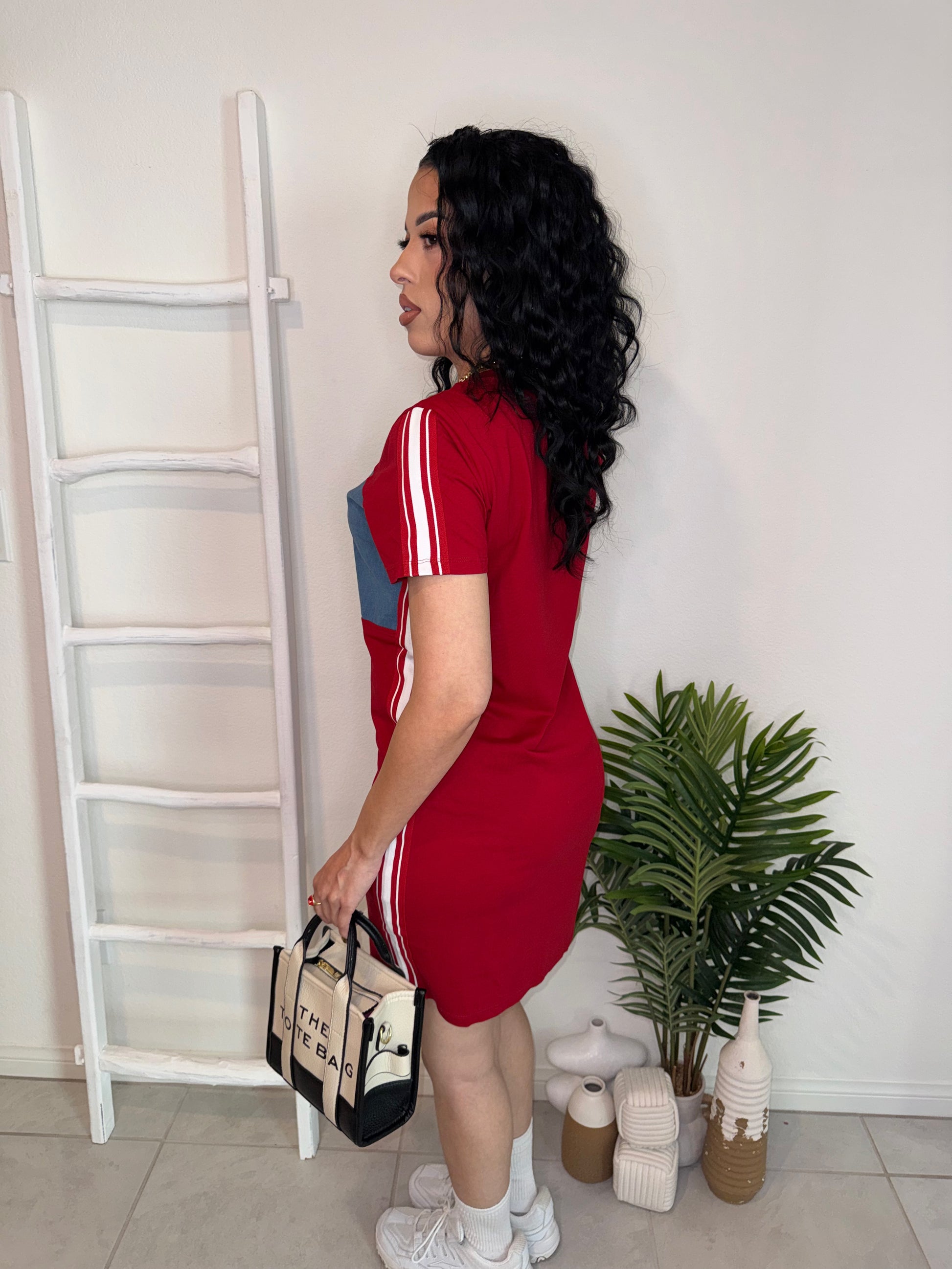 Vestido corto en tono rojo intenso con diseño moderno y detalle en contraste tipo denim en el área del pecho que aporta un toque único y trendy. Su corte ajustado realza la figura, mientras su tela suave y elástica brinda comodidad durante todo el día o la noche.