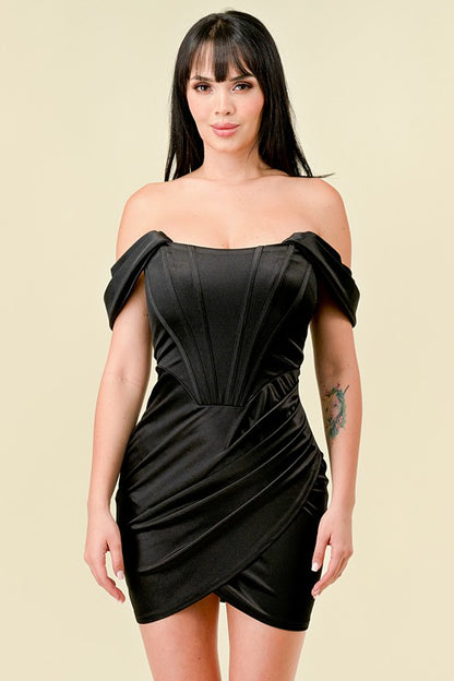 Embrace timeless style with the Satin Off-The-Shoulder Pleated Mini Dress in Black, offering sophistication and grace. Suitable for various occasions.